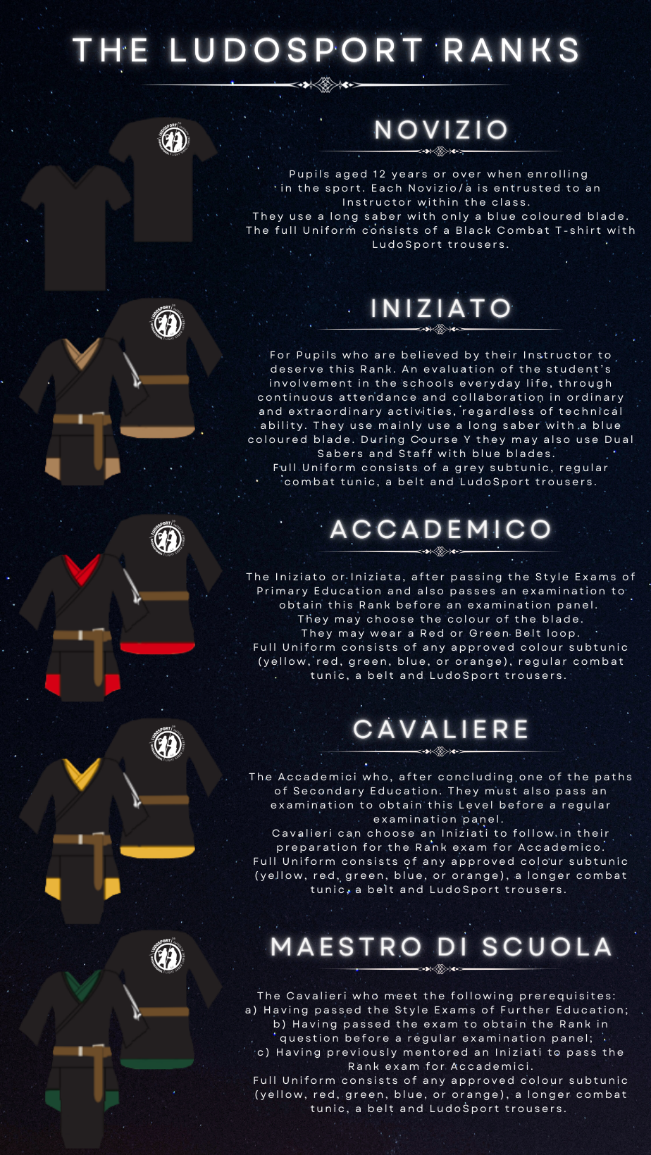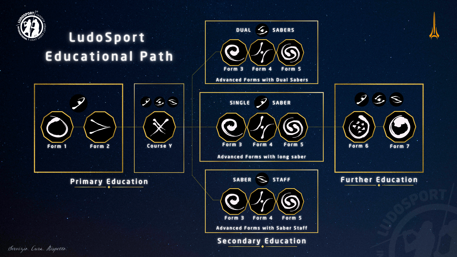 Around the same time as the athlete completes Course Y, they may participate in their second rank exam to the rank of Accademico. In this exam, the athlete will present their affinity with the base forms in combat and theory. Passing this exam allows the athlete to select the colour of their uniform’s subtunic and lightsaber blade in official combat.